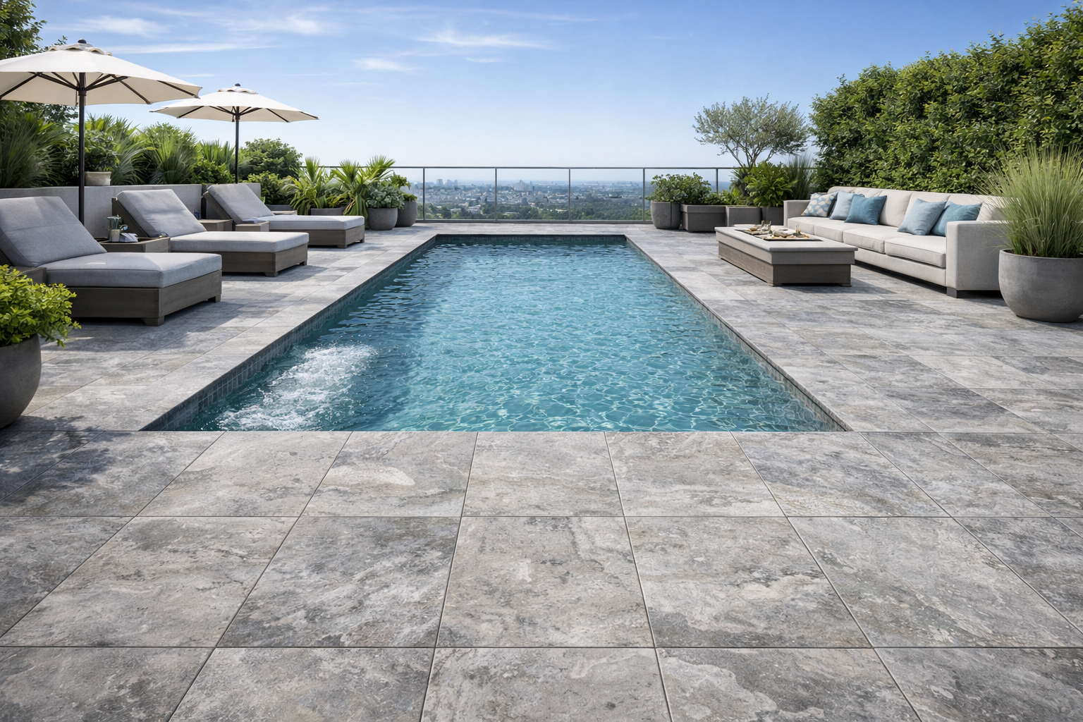 The cool-toned colorway also supports comfortable surface temperatures, making it an excellent choice for sun-exposed pool decks, outdoor entertainment spaces, or light-filled rooftop terraces.